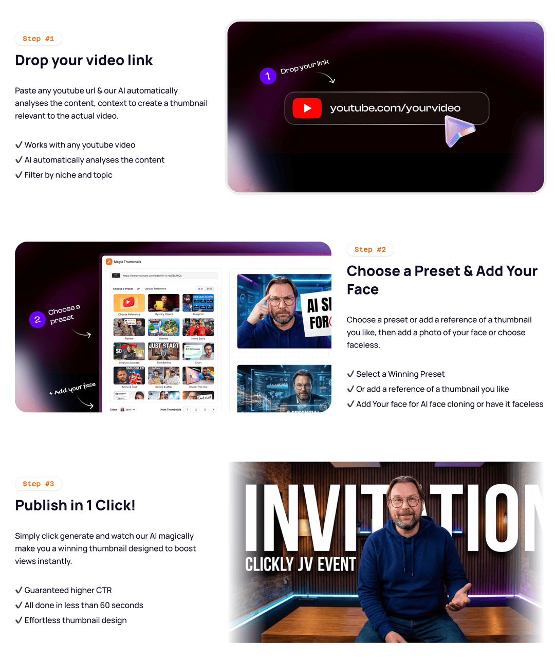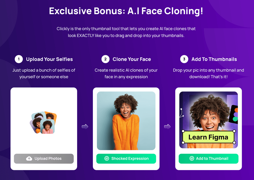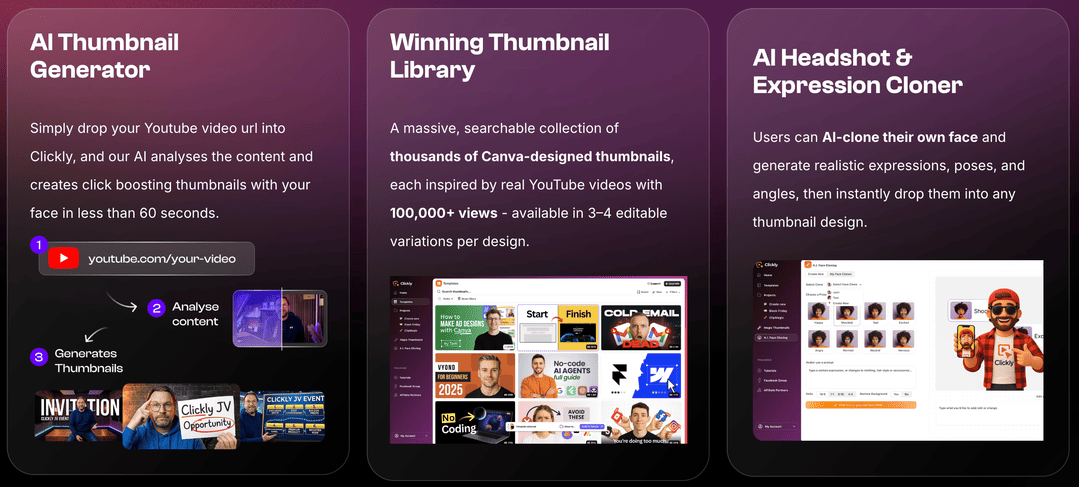 ✅AI Thumbnail Generator: Simply drop your Youtube video url into Clickly, and our AI analyses the content and creates click boosting thumbnails with your face in less than 60 seconds.