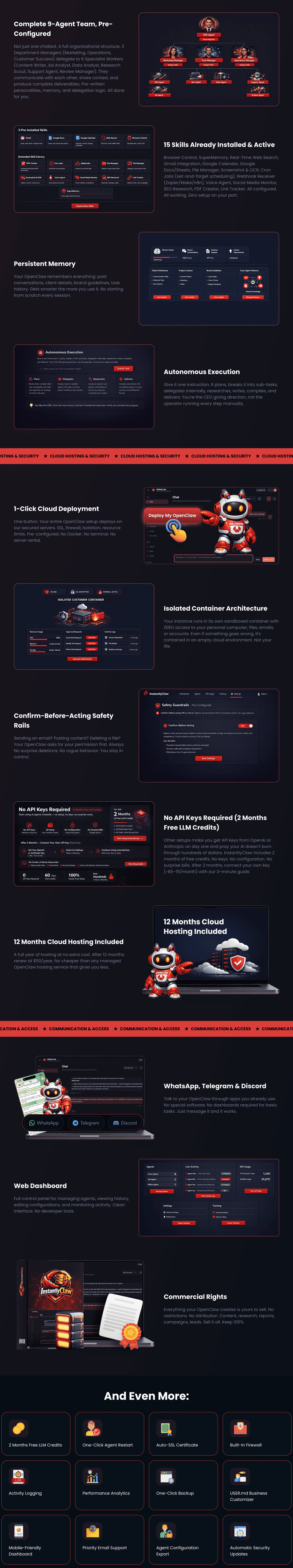 - 15 pre-installed skills (Gmail, Google Docs/Sheets, Browser Control, Web Search, SEO Research, Social Media Monitor, PDF Creator, Cron Jobs, Webhooks, Google Calendar, File Manager, Screenshot/OCR, Voice Agent, Link Tracker, SuperMemory)