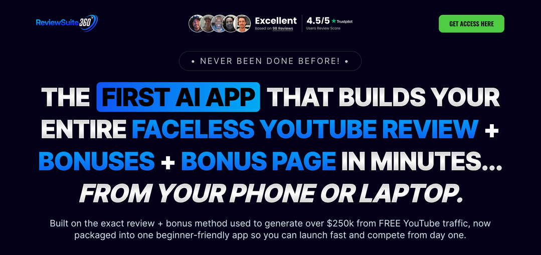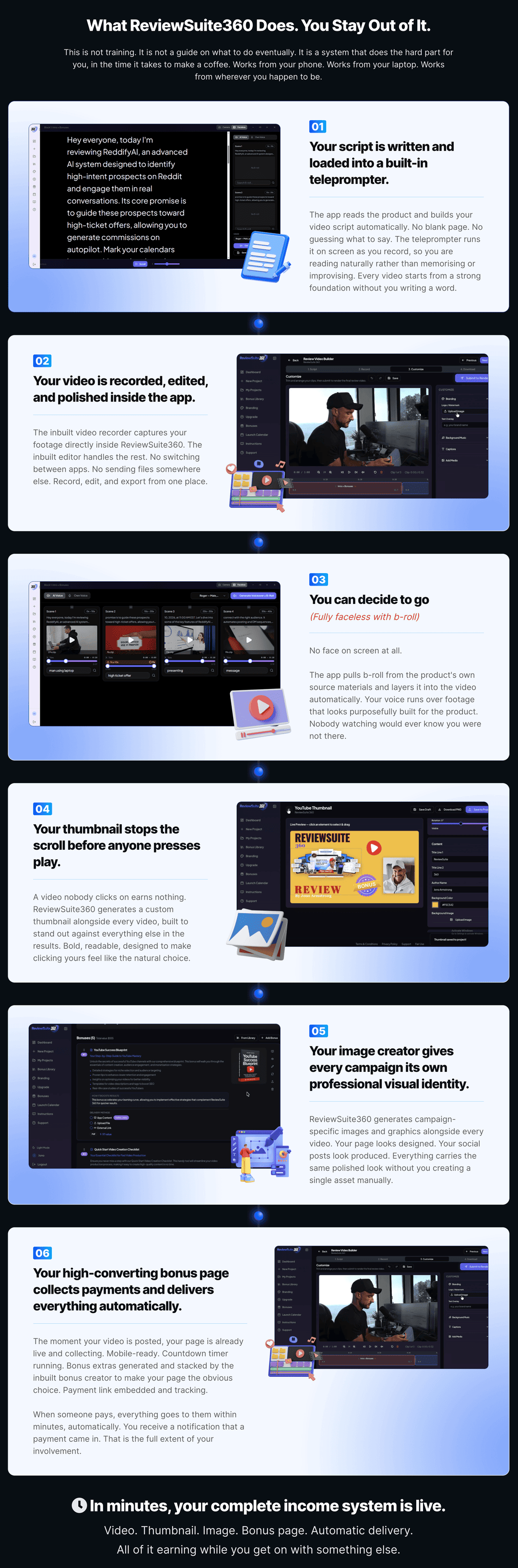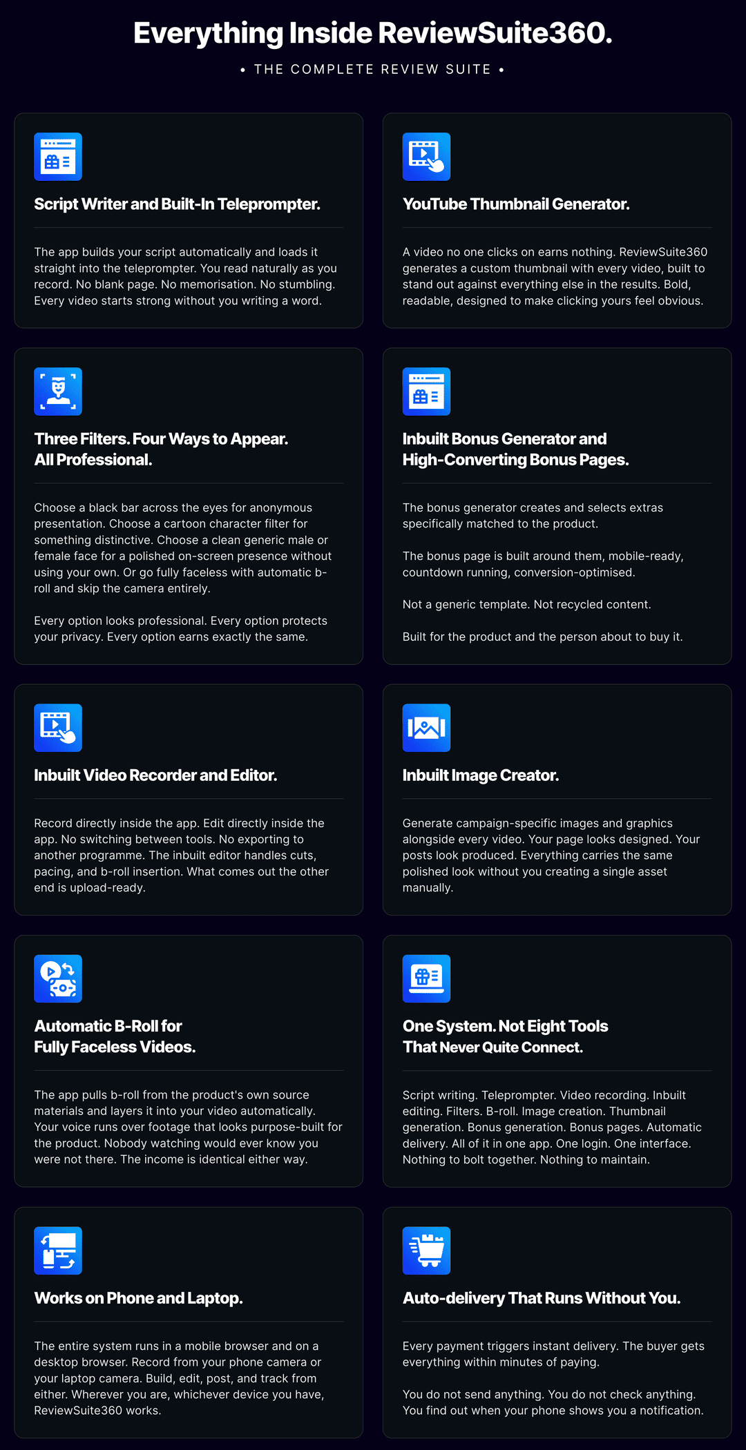 ReviewSuite 360 is an all-in-one launch jacking software built with AI. It writes your script for you (based on Jono’s proven method), lets you stay anonymous with built-in video filters, builds your high-converting bonus page, creates and designs your bonuses at the push of a button, delivers everything automatically and positions users in front of Free hungry buyer traffic at exactly the right time.